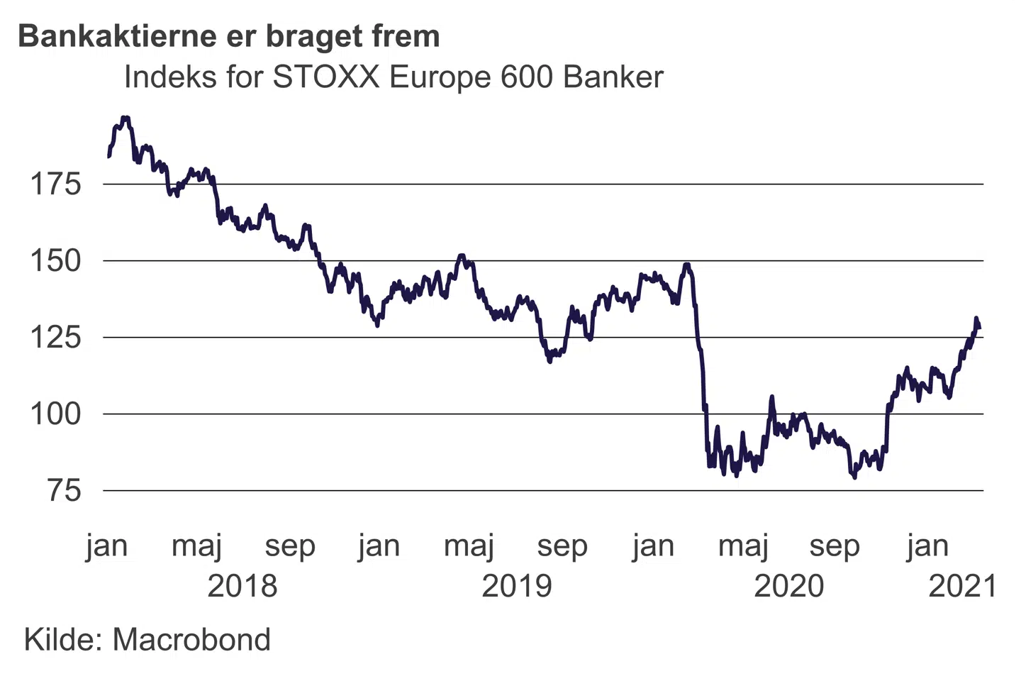 Men kan de europæiske bankaktierne stige mere efter en sådan spurt? Ja, lyder det fra de fleste strateger, jeg taler med. For selvom præstationen i 2021 har været opsigtsvækkende, er sektoren som helhed ikke kommet sig over coronanedturen i foråret – eller finanskrisen for den sags skyld. Aktierne har simpelthen været trykket så langt ned, at der ifølge analytikere stadig er gevinster at komme efter. Det amerikanske finanshus Citi gentog for eksempel i denne uge sin »overvægt«-anbefaling på sektoren og udpegede i Europa de nordiske banker som nogle af vinderne. Citi har Danske Bank, Nordea og Handelsbanken på »købslisten«.