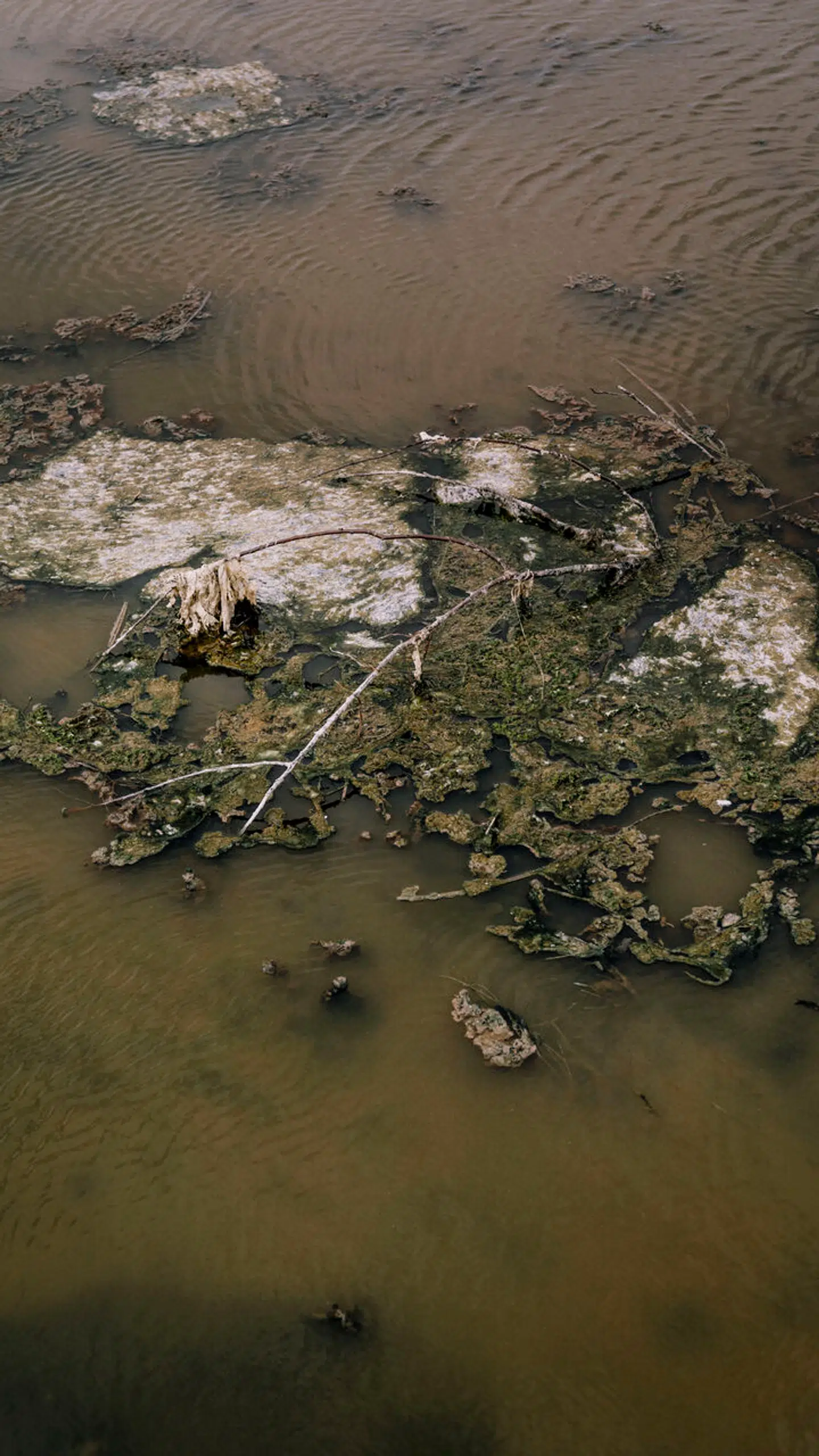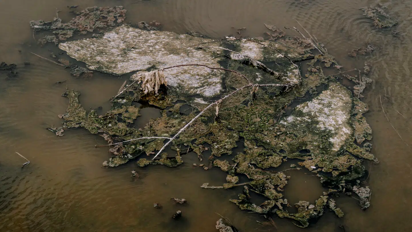 Plamager af alger flyder rundt på overfladen.