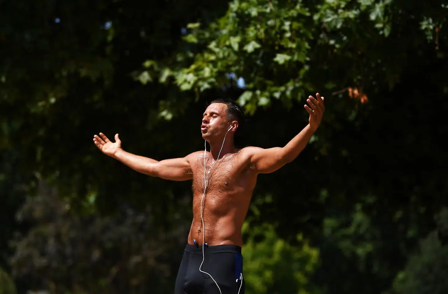 Trods varme temperaturer, og selvom det britiske vejrinstitut har udsendt advarslen »rød alarm«, afholder det ikke manden her fra at motionere i solskinsstrålerne i St. James Park i London.