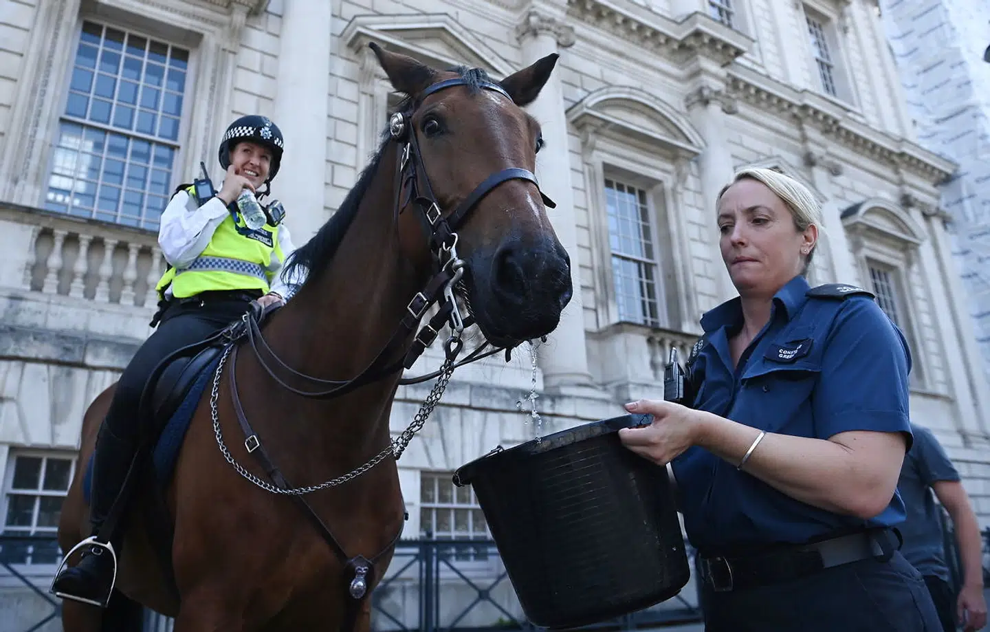 Det er ikke kun mennesker, men også dyr, der har brug for vand i varmen. Blandt andet politihestene som her får en tår vand fra en spand.