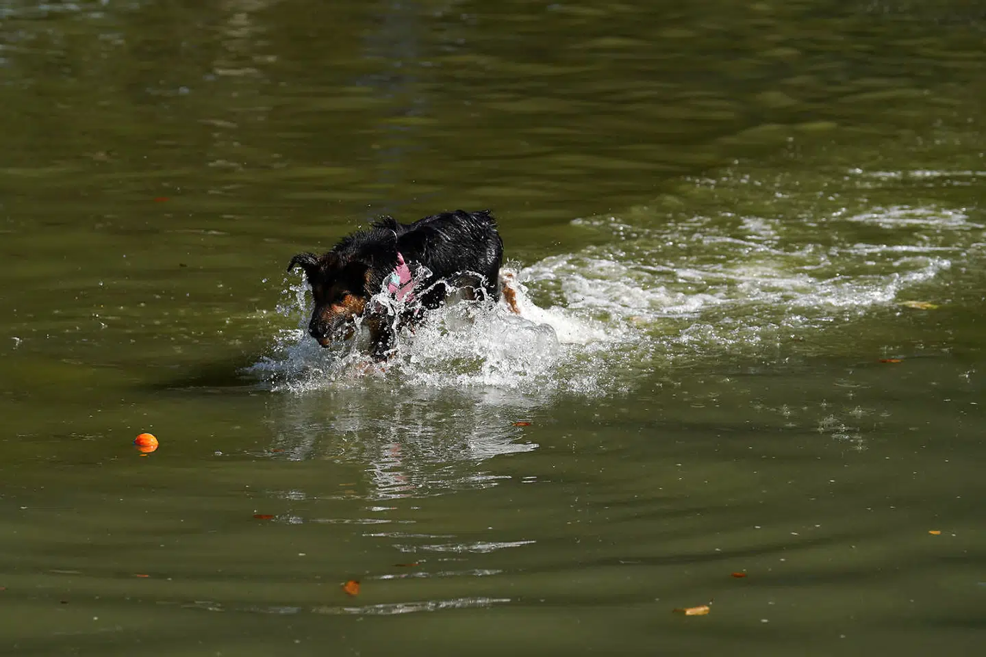 Hundene har også fået nok af temperaturerne. En af dem har besluttet sig for at tage en dukkert i en sø i Greenwich Park.