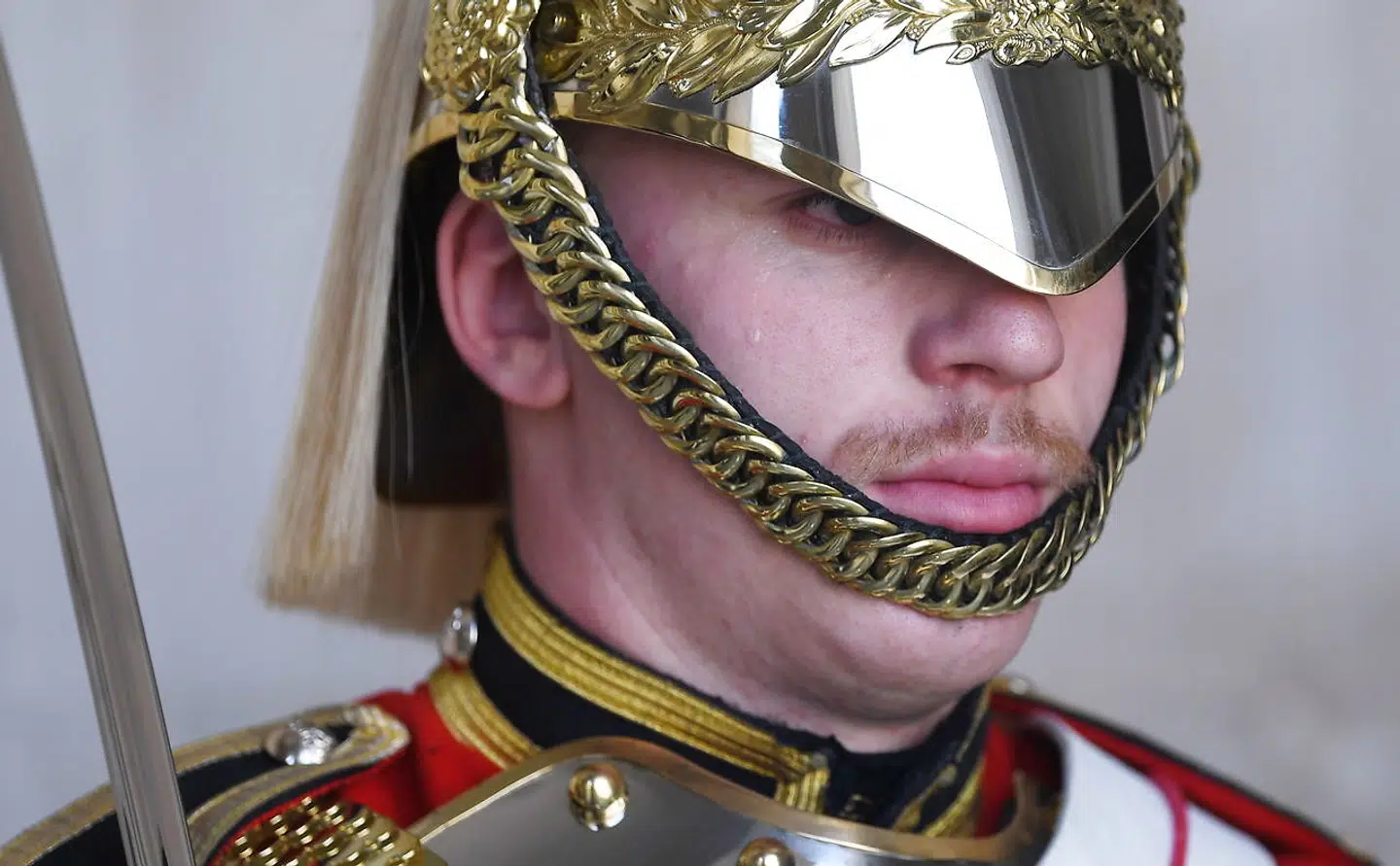 Det er ikke alle, der har det lige køligt. En sveddråbe pibler ned ad ansigtet på et medlem af Queens Guard.