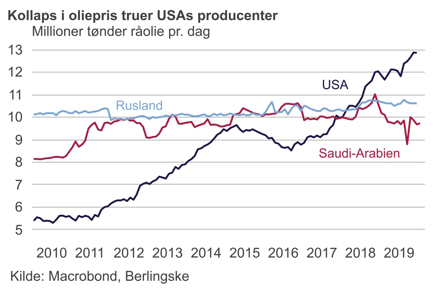 Den stigende amerikanske olieproduktion har været en særlig torn i øjet på Saudi-Arabien. Præsident Donald Trump har længe ønsket lavere oliepriser, men ikke til det nuværende niveau; i USA er den nede på 34 dollar pr. tønde.