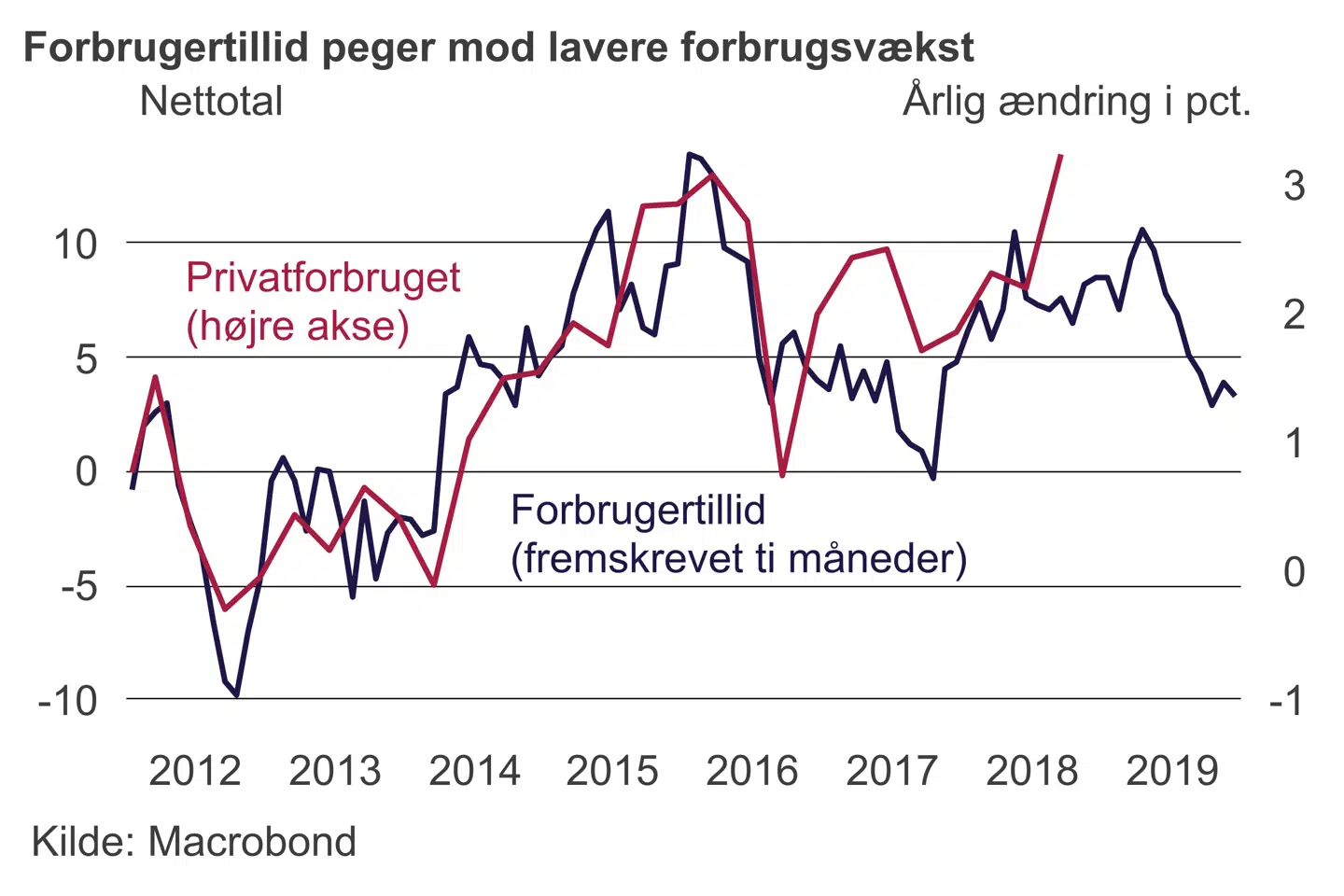 Den svage udvikling i forbrugertilliden kan indikere, at det danske privatforbrug vil udvikle sig svagere i de kommende måneder. Og da privatforbruget udgør omkring halvdelen af den økonomiske aktivitet i Danmark, vil det kunne mærkes på væksten i dansk økonomi, hvis privatforbruget falder.