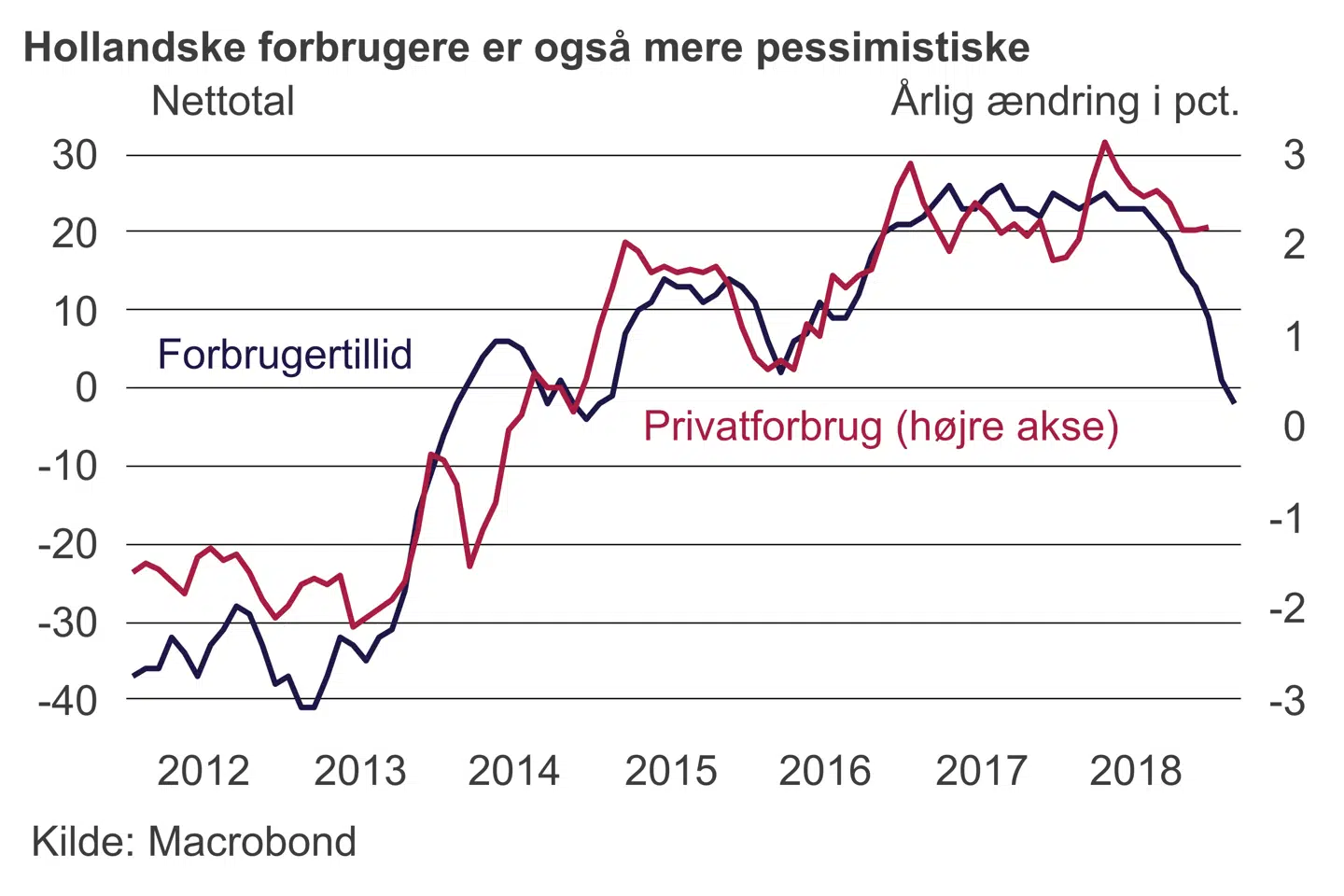 Det er blandt andet tilfældet i Holland, hvis økonomi på mange måder minder om Danmarks. De nye tal for forbrugertilliden i februar viste en fortsat faldende tendens til det laveste niveau siden begyndelsen af 2015.