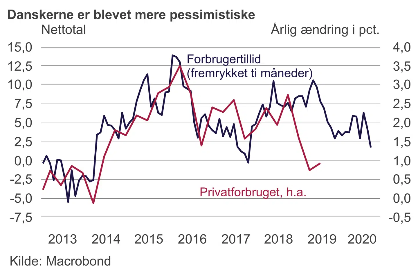 På trods af rekordlav ledighed og flotte stigninger i indkomsterne er danskernes humør rykket tilbage i kulkælderen. Forbrugertilliden faldt således i oktober til det laveste niveau i tre år. Dermed er den primære vækstmotor i dansk økonomi – privatforbruget – truet.