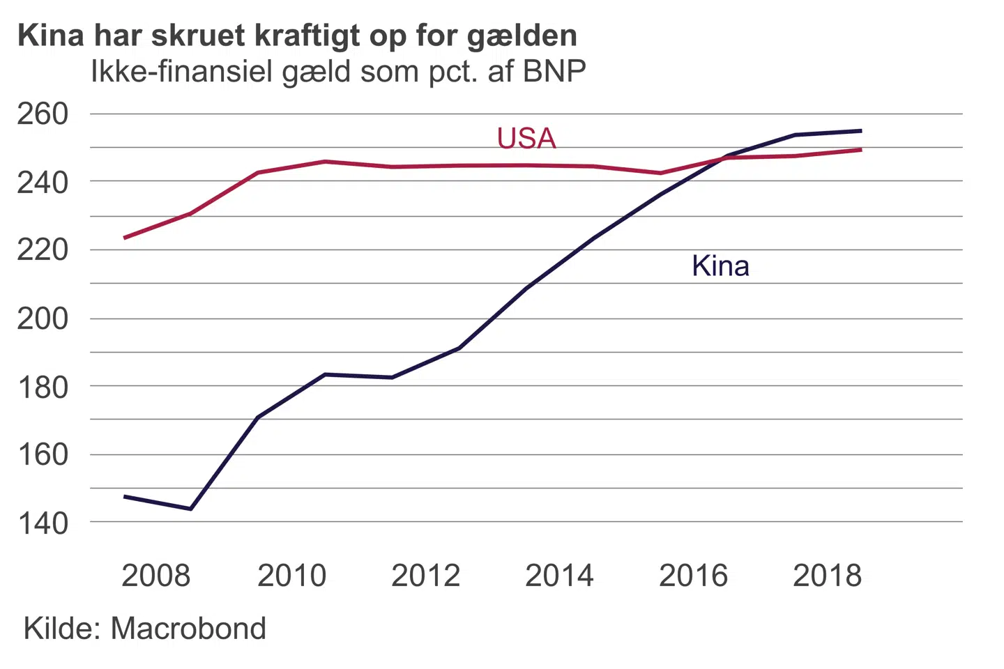 Den store stigning i den globale gæld skyldes blandt andet, at gælden er steget kraftigt i USA. Både de amerikanske virksomheder og den amerikanske stat har nu en rekordhøj gæld, viser den seneste gældsopgørelse fra IIF. Men også flere af de nye vækstøkonomier – emerging markets – har øget gælden i årets første måneder. Det gælder navnlig Kina, der med store stimulanspakker og lempeligere kapitalkrav til bankerne forsøger at holde hånden under en økonomi, der er under pres fra handelskrigen med USA.