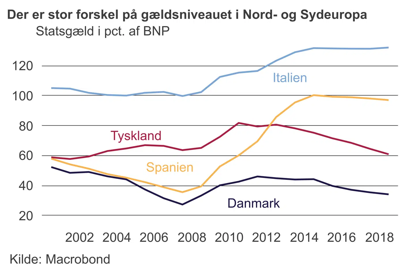 Det er blandt andet tilfældet i flere europæiske lande. Ser man bort fra udviklingen i Italien, hvor store budgetunderskud kombineret med lav vækst er med til at øge gældsætningen, har flere af de sydeuropæiske lande, der blev hårdest ramt af finanskrisen, formået at nedbringe deres gældsbyrde de seneste år.