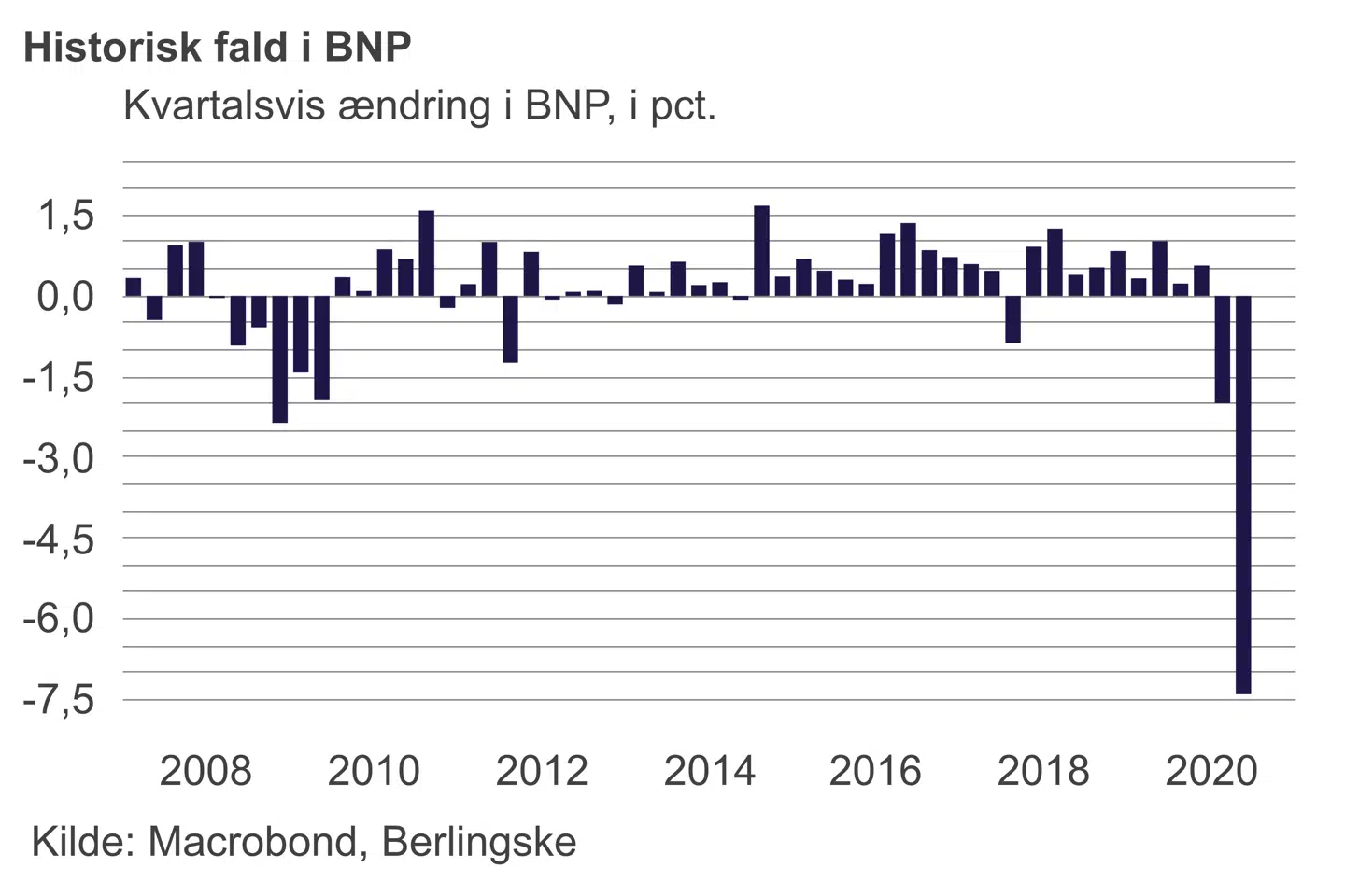 Det er Danmarks Statistiks såkaldte BNP-indikator, der viser, at BNP-væksten i Danmark var minus 7,4 i andet kvartal. BNP-indikatoren er et foreløbigt estimat af væksten, og på grund af »særlige omstændigheder omkring covid-19« er der ekstra usikkerhed forbundet med den seneste opgørelse, fremhæver Danmarks Statistik.