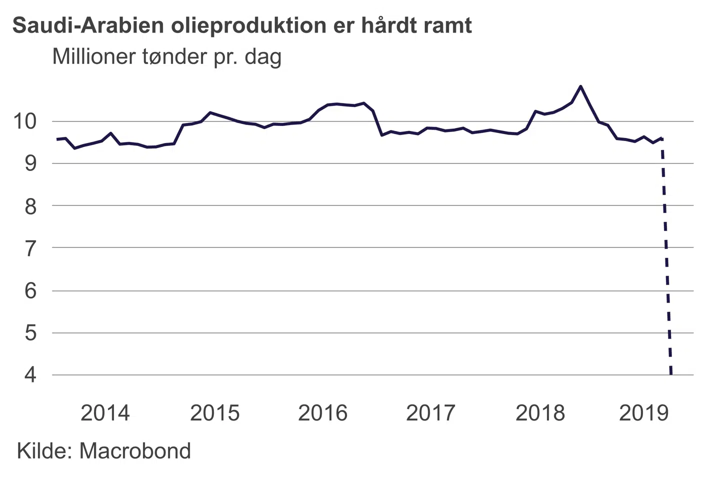 Olieprisen tog et stort hop mandag efter droneangrebet på de saudiske olieanlæg i weekenden. Det vurderes, at den saudiske olieproduktion er reduceret med 5,7 millioner tønder pr. dag, hvilket svarer til ca. fem procent af den globale produktion af råolie og råolieprodukter. Desuden er Saudi-Arabien den eneste olieproducent, der har kapacitet til at udvide produktionen betydeligt. Denne kapacitet er også blevet ramt.