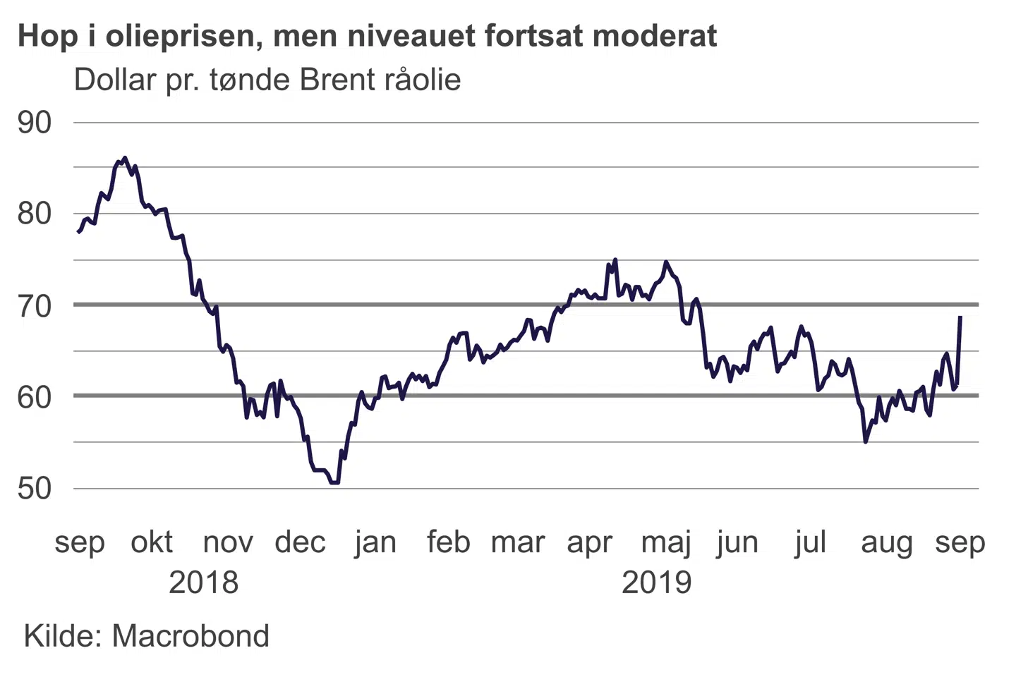 Olieprisen er steget, men selv springet er højt i procent, så er prisen faktisk ikke højere end den var i maj – og fortsat i intervallet 60 til 70 dollar pr. tønde, som lidt er et »Guldlok«-niveau – ikke for højt til at skade forbrugerne og ikke for lavt til at skade producenterne. Derfor skal man også tage dommedagsprofetier om den økonomiske virkning med et gran salt.