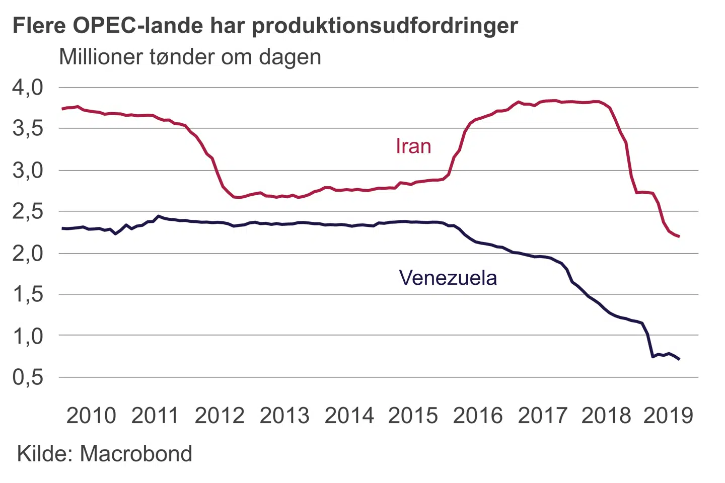 I alt er produktionen i Iran og Venezuela halveret siden 2017 med et samlet produktionsfald på 2,9 millioner tønder pr. dag.