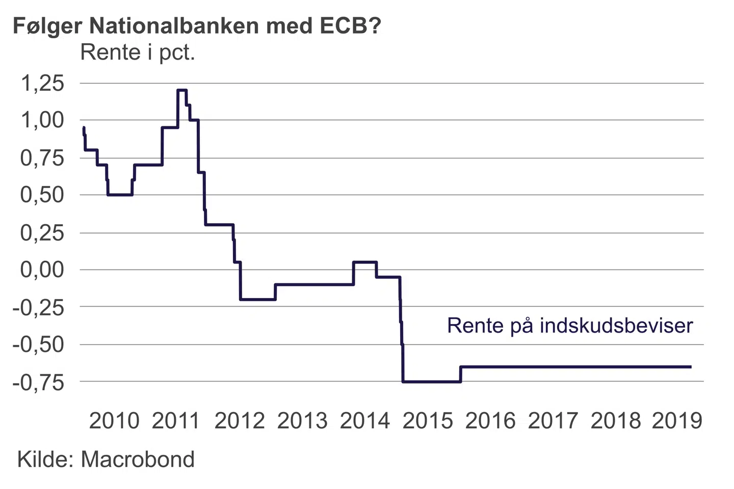»Normalt følger Danmarks Nationalbank med, når ECB ændrer renten, men denne gang er det vores bud, at de vil holde sig på måtten. Kronen er i forvejen lidt til den svage side, og dermed er der ikke så stor risiko for, at den vil blive for stærk, hvis Nationalbanken ikke gør noget. Desuden indfører ECB også instrumenter, der skal mindske de problemer, som de negative renter skaber for euroområdets banker. Det trækker i retning af at gøre ECBs rentenedsættelse knap så stor i realiteten, som den er på papiret,« skriver Las Olsen i en kommentar.