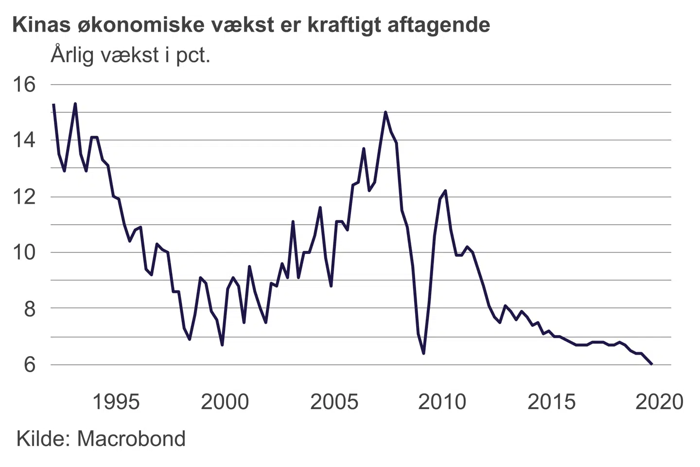 Det er på trods af, at væksten i verdens næststørste økonomi er gået markant ned i omdrejninger det seneste år. I tredje kvartal faldt den kinesiske årsvækst til seks pct. Det kan lyde højt i europæiske ører, men i Kina er det den laveste vækstrate i 27 år.