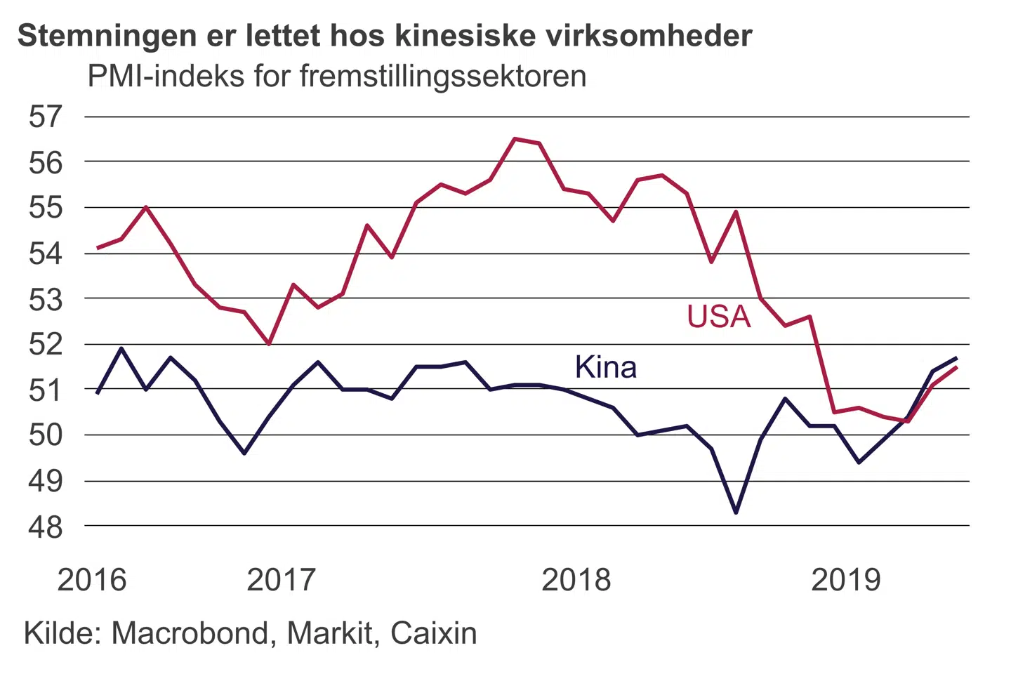 Humøret er steget hos de kinesiske virksomheder, der ellers har været plaget af handelskrigen mellem USA og Kina. Faktisk viser de seneste PMI-tal fra Caixen, at humøret blandt de kinesiske fremstillingsvirksomheder er på det højeste niveau i tre år.