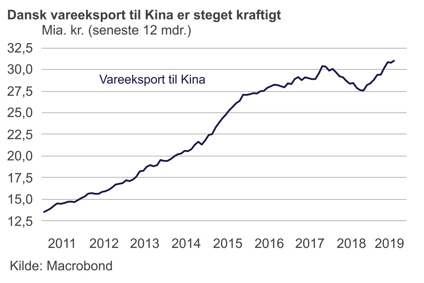 Hvis den kinesiske økonomi kommer op i gear, er det godt nyt for de mange danske virksomheder, der siden årtusindskiftet har satset på Kina som eksportmarked. Det seneste år har danske eksportvirksomheder sendt varer med en samlet værdi på over 30 mia. kroner til Kina. Det giver Kina en sikker placering i top-ti på listen over Danmarks vigtigste eksportmarkeder.