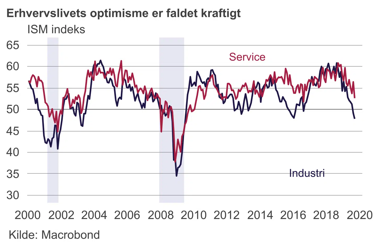Den vigtige indikator for tilstanden i de store industrivirksomheder (ISM) faldt i september til det laveste siden 2009. Men to gange siden finanskrisen har ISM befundet sig nogenlunde på tilsvarende niveau – og går man endnu længere tilbage i tiden, skal ISM langt under en værdi på 45, før industrien kan trække hele økonomien i minus. ISM var i september på 47,8.