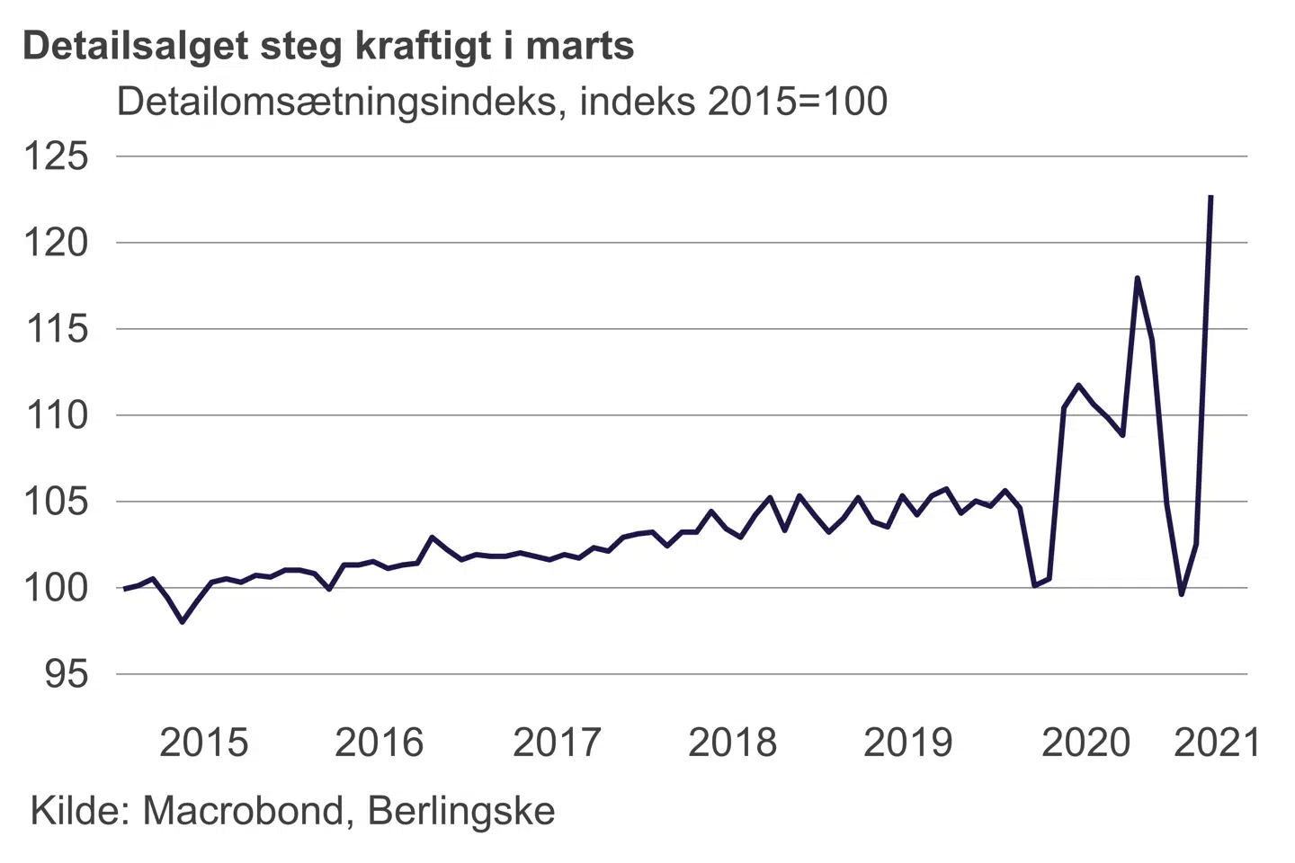 »Detailsalget er en god start, når vi ser på den genstart, som dansk økonomi skal have. Det her er dybest set slutningen af første kvartal, men jeg havde ikke forventet, at det var gået så godt. Det viser mere end tydeligt, at danskerne er klar til at bruge nogle penge,« siger Jeppe Juul Borre, cheføkonom i Arbejdernes Landsbank.