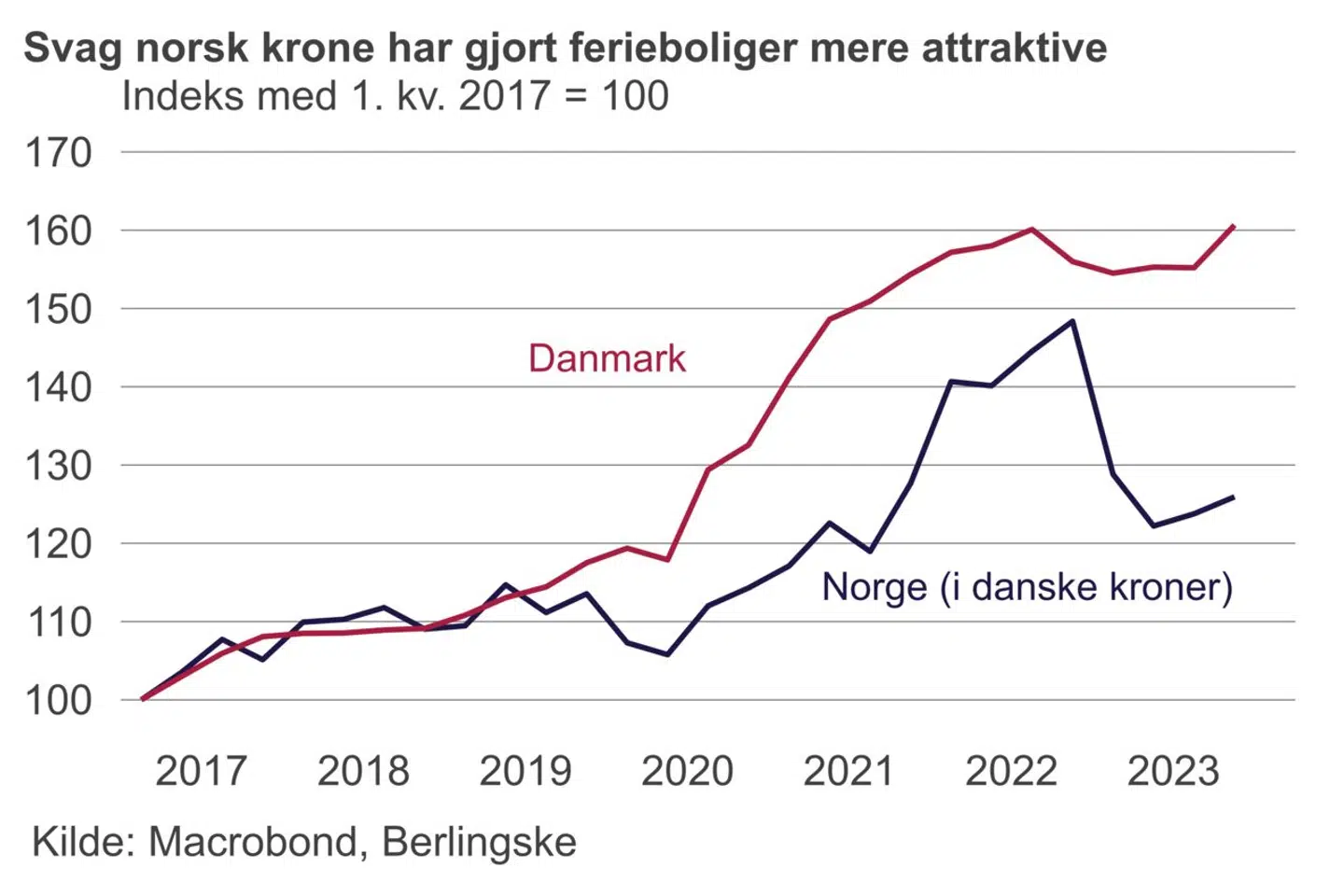 Aktuelt betyder det, at en gennemsnitlig feriebolig i Norge koster 2,94 millioner norske kroner, hvilket svarer til 1,93 millioner danske kroner, skriver Finans.
