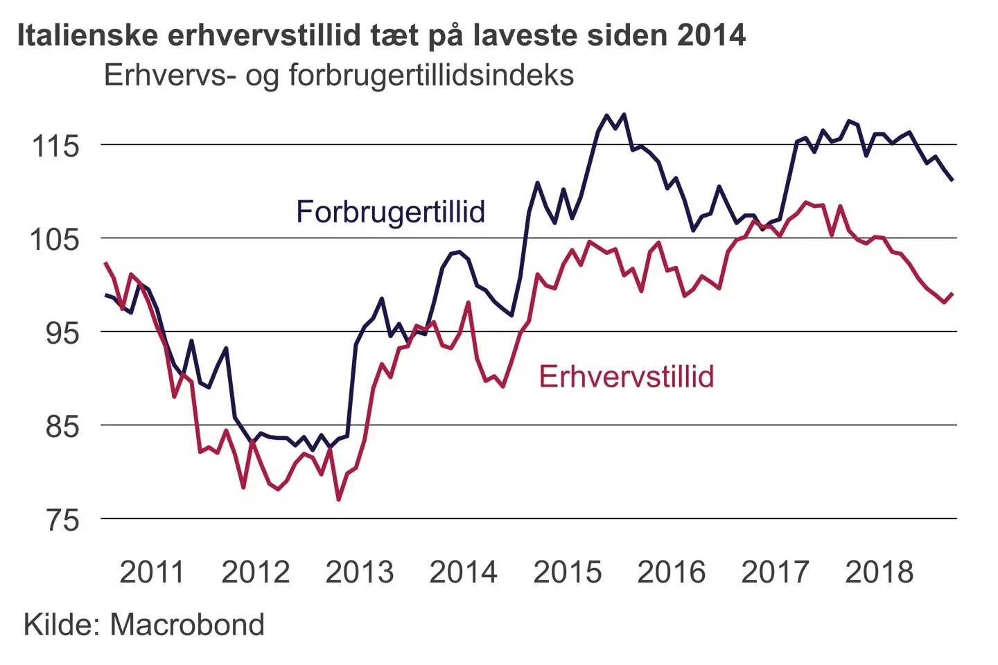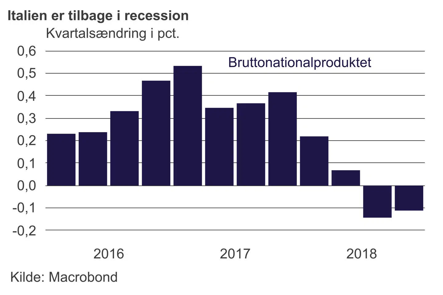 Siden da er det gået fra skidt til værre med italiensk økonomi, der er i recession efter fald i aktiviteten i anden halvdel af 2018. Beskæftigelsen falder også, mens arbejdsløsheden steg til 10,7 pct. i februar. Optimismen i industrien har peget på tilbagegang i aktiviteten siden september med tendens til en accelerering i faldet.