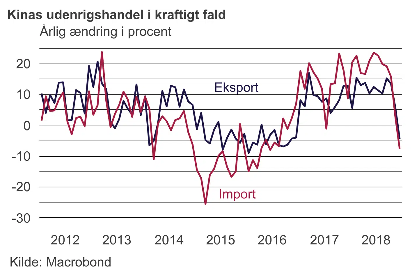 Den kinesiske udenlandshandel faldt kraftigt i december. Faldet skete både i den kinesiske import fra udlandet samt i eksporten til udlandet. En del af forklaringen kan skyldes lagerophobning i specielt USA, da der er tidligere på året har været høje handelsrater. Dog er det globale fald i forbruget en faktor, som har direkte betydning for den kinesiske udenrigshandel.
