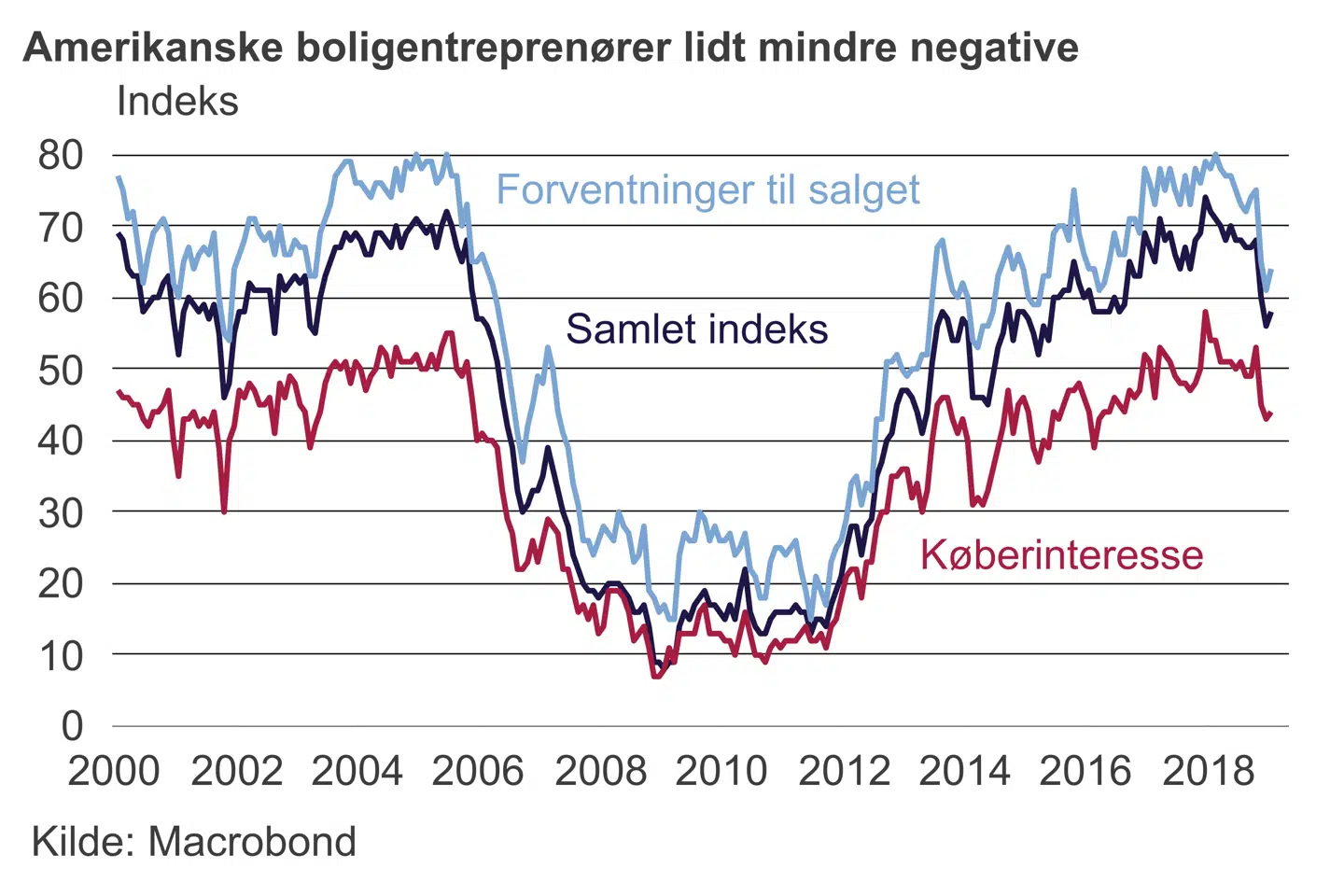 Optimismen hos amerikanske boligentreprenører faldt kraftigt mod slutningen af 2018 og skabte bekymring for en større afmatning på boligmarkedet. Indekset steg en anelse i januar, så man undgik et totalt kollaps. Det ændrer dog ikke på, at boliginvesteringerne ser pressede ud i årets første kvartal.