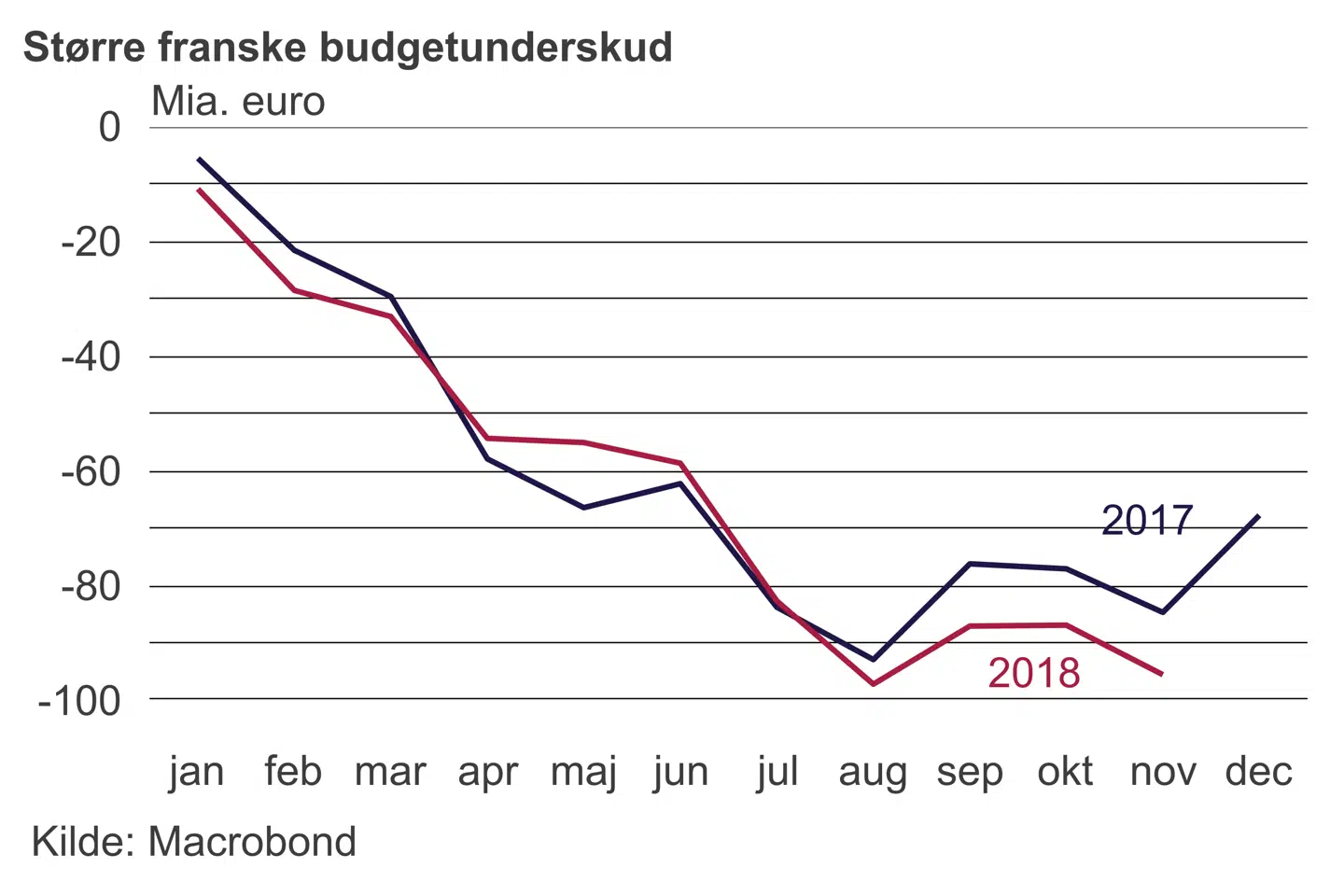 På trods af en svag økonomisk vækst og lavere renteudgifter har det franske budgetunderskud de seneste fire måneder været større end i samme periode i 2017. Der er udsigt til en yderligere forværring i år som følge af de nye tiltag efter gadeurolighederne i november og december. Det er en udfordring for det finanspolitiske regelsæt i euroområdet.
