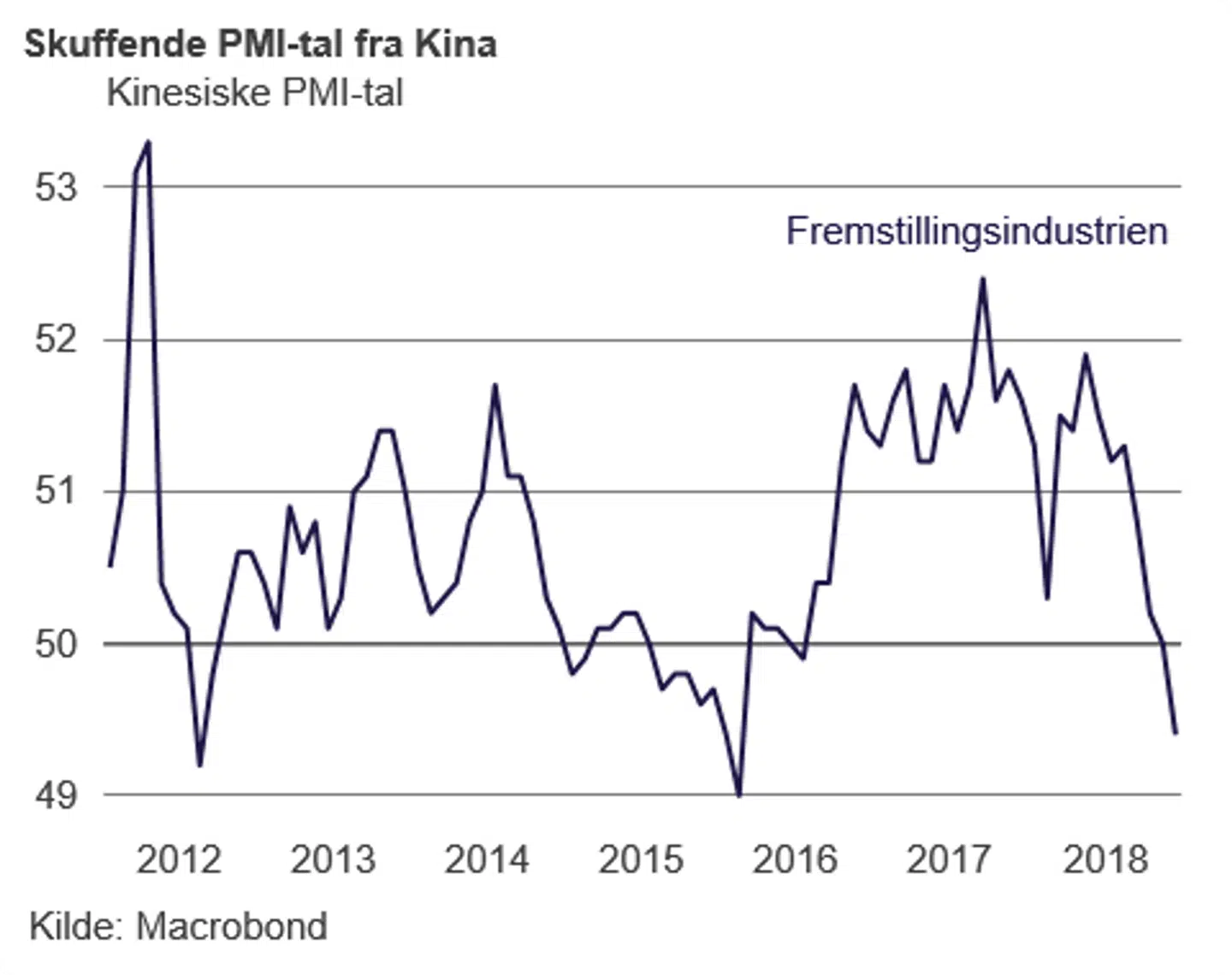 Det kinesiske PMI-tal, der måler aktiviteten inden for fremstillingsindustrien, faldt til det laveste niveau i 19 måneder. Samtidig kom tallet under 50, hvilket er et vigtigt niveau, da det indikerer, at væksten i sektoren er aftagende. Det har skabt øget frygt for, at verdens anden største økonomi står over for en kraftig økonomisk opbremsning.