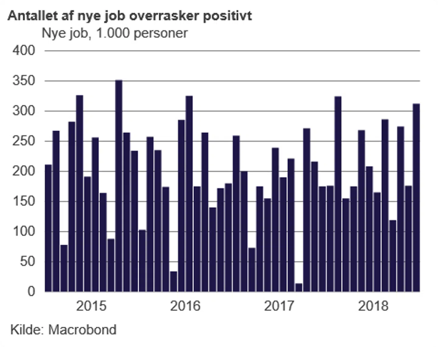 Fra USA kom også det amerikanske »kongetal«, tallet for beskæftigelsen i USA. I december blev der skabt 312.000 nye job uden for landbruget, hvilket var væsentligt over de 176.000 nye job, der blev skabt i november. Estimater fra Bloomberg viser, at der var ventet en jobskabelse uden for landbruget på 184.000 i december. Samtidig steg den gennemsnitlige timeløn med 3,2 pct. i forhold til samme periode et år tidligere, og arbejdsløsheden steg fra 3,7 pct. i november til 3,9 pct. i december.