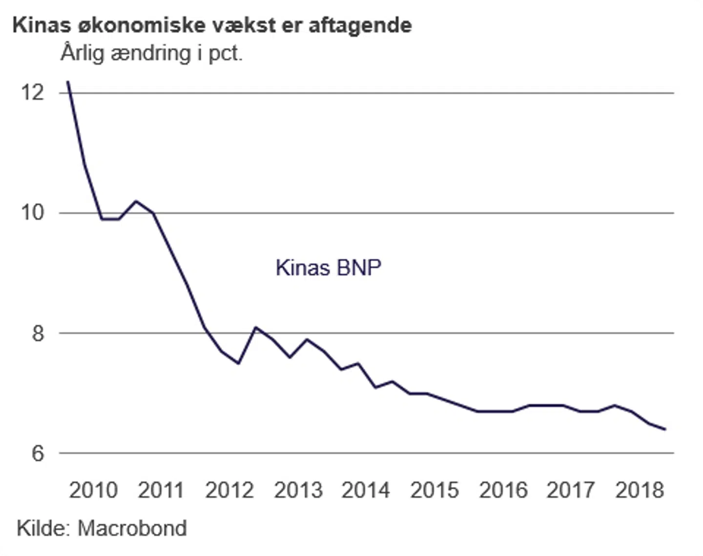 Kina, der i de første par år efter finanskrisen oplevede vækstrater på over 10 pct., er nu nede på næsten en halvering i den årlige økonomiske vækst. I fjerde kvartal 2018 var den årlige ændring i BNP på 6,4 pct. mod 6,7 pct. i samme kvartal året før. Det er især handelskrigen med USA og en oprydning i erhvervsudlånet, der på det seneste har været med til at trække vækstraterne i Kina ned.