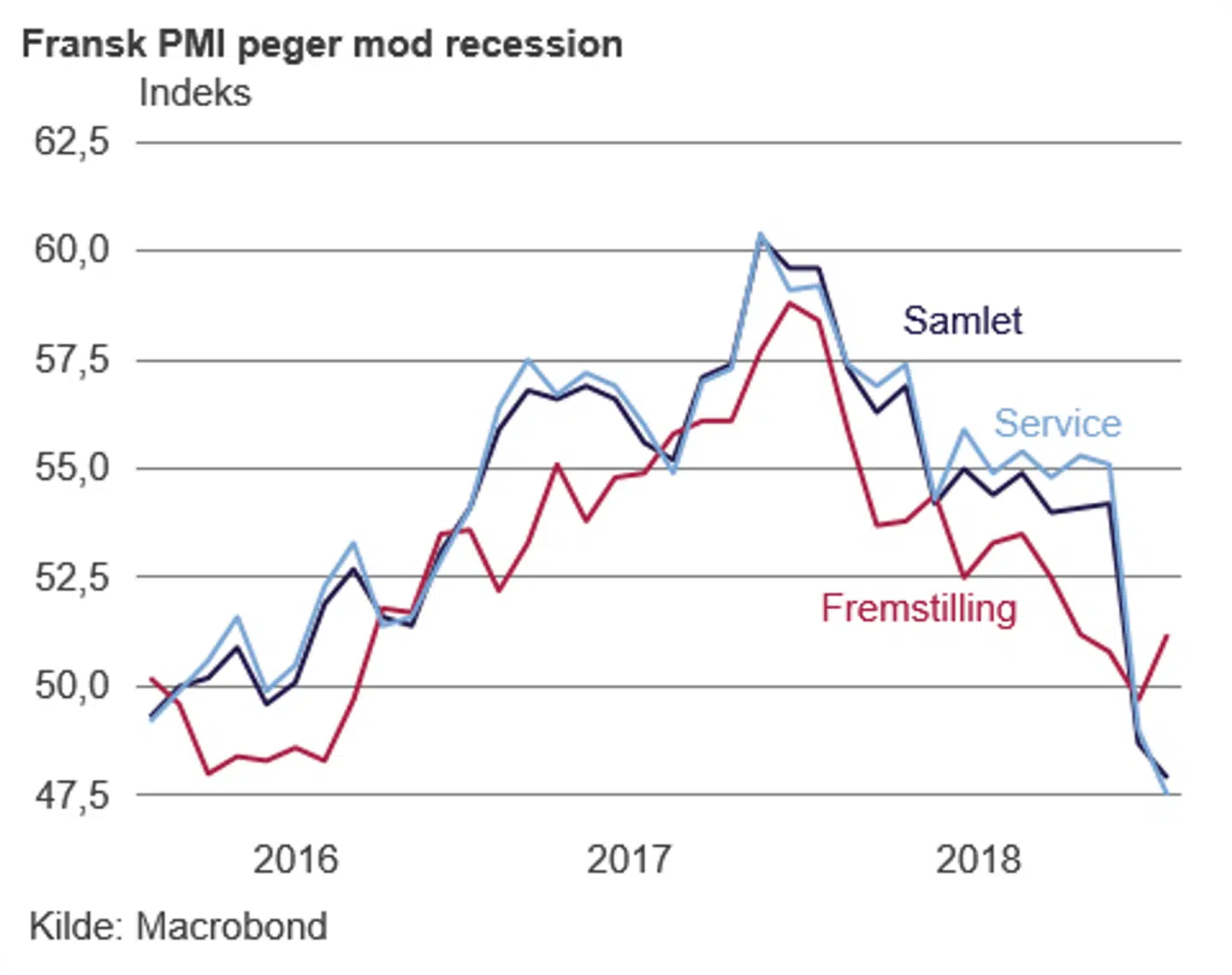 I mandags kom den internationale valutafond (IMF) endnu en gang med nedjusteringer i forhold til vækstudsigterne for verdensøkonomien. Den globale årlige vækst lå i tiden op til finanskrisen på over fire pct. og tilmed i en periode på over fem pct. Med en PMI for den globale fremstillingssektor der i 2018 kun er gået nedad ser vækstudsigterne mørkere ud som tidligere.