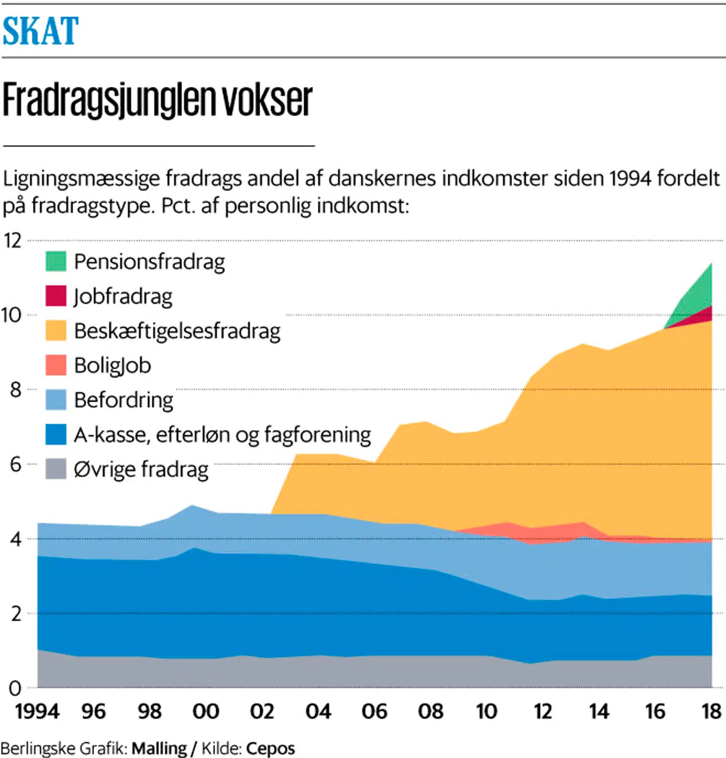 Nu har den borgerligt-liberale tænketank Cepos opgjort, at de såkaldt ligningsmæssige fradrag siden 1994 er vokset fra at udgøre 4,5 procent af danskernes indkomster til knap ti procent i 2018. Det svarer til, at danskerne får 134 milliarder kroner i fradrag.