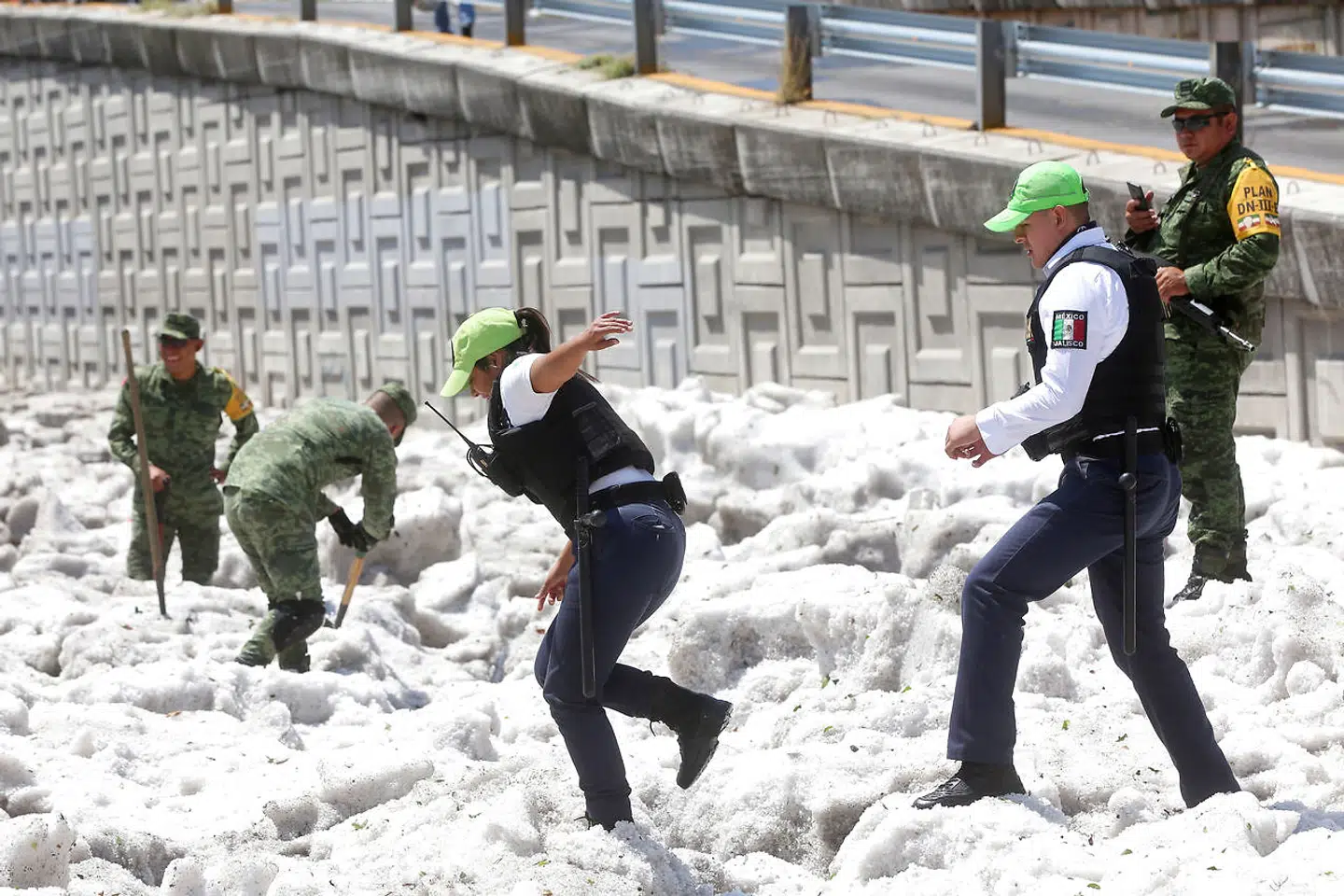 Traktorer og andre læssemaskiner måtte i aktion for at fjerne de store mængder hagl fra gaderne i Guadalajara. REUTERS/Fernando Carranza FERNANDO CARRANZA
